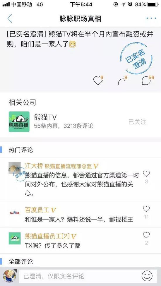 有趣的是,脉脉中关于熊猫直播融资、并购、现金流问题的多条爆料,被一位实名认证“熊猫直播流程部总监江大桥”的人多次辟谣,据记者了解,熊猫内部并没有流程部,也没有叫江大桥的员工。