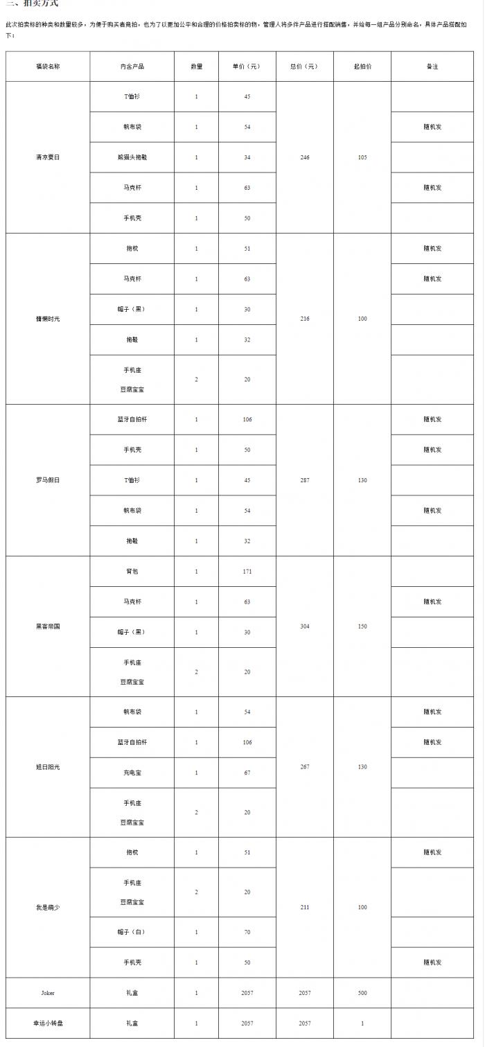 拍卖公告称,因拍卖标的种类和数量较多,为便于购买者竞拍,也为了以更加公平和合理的价格拍卖标的物,管理人将多件产品进行搭配销售,并给多件产品组合成为“福袋”并各自命名。拍品包括帽子、拖鞋、帆布包、手机壳、充电宝等23种物品。