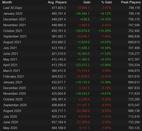 与2021年12月相比,Dota2平均在线玩家增长了8.12%。日均玩家为48.5万人,比上月增加了3.6万人。Dota2上一次人数的暴涨是在2021年10月份与4月份,TI10的成功举办与动漫《DOTA:龙之血 第一季》上架网飞使Dota2的游玩人数始终保持着较高的峰值人数与不错的平均在线人数。