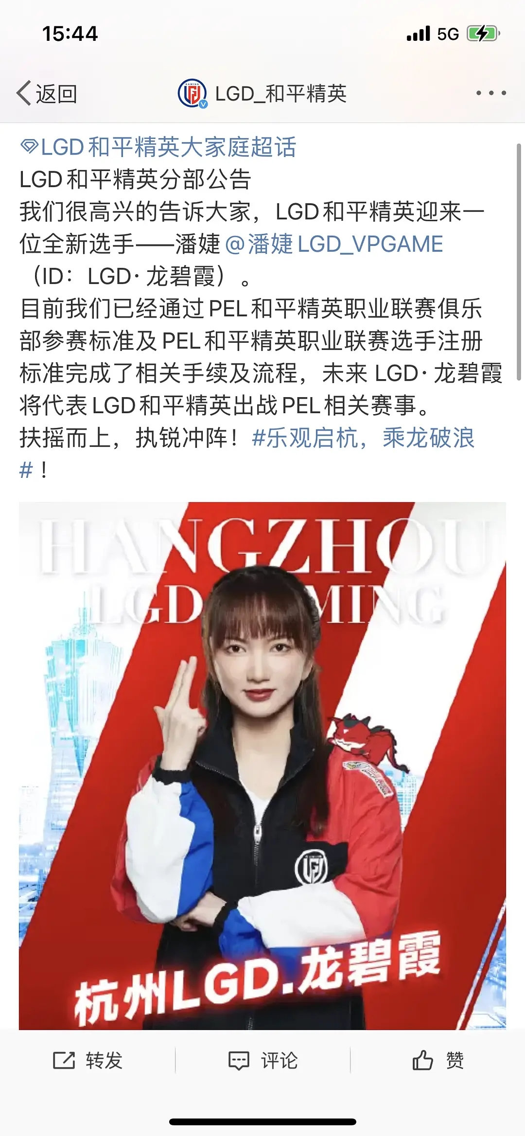 2月25日,LGD战队-和平精英分部官宣,战队将加入一位新选手,ID为龙碧霞。