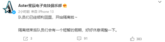 另外,说下国内本届取得最好成绩(第四名)Aster战队已经回国开始隔离,下面是他们的官方微博:
