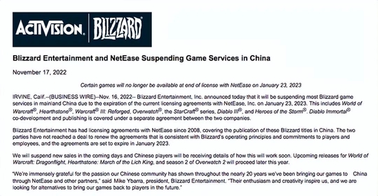 11月16日,美国暴雪娱乐公司发布声明称,由于同网易的现有授权协议将在2023年1月23日到期,该公司将暂停在中国大陆的大部分暴雪游戏服务。暴雪声明指出,双方没有达成符合暴雪运营原则和对玩家及员工承诺的续约协议,这些协议将于2023年1月到期。