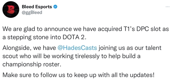 近日,电竞组织Bleed在他们的官推上宣布,他们将正式接替T1在东南亚DPC联赛的席位。